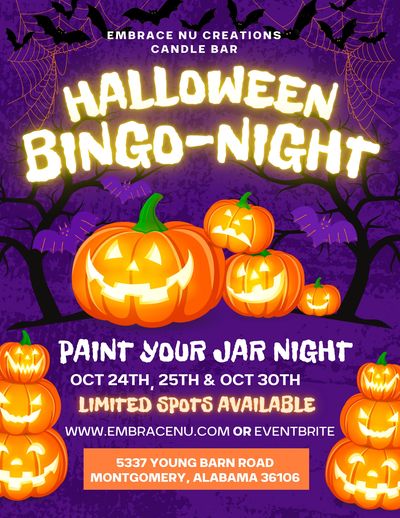Get ready for a spooktacular evening of Halloween fun at our Halloween BINGO Night! Join us at our candlestore for a night filled with glowing jack-o'-lanterns, spooky bats, and leafless trees. Grab your friends and family for a thrilling game of BINGO, complete with Halloween-themed prizes and treats. Don't miss out on this exciting event that is sure to get you in the Halloween spirit. See you there! - Click the Picture to Begin >